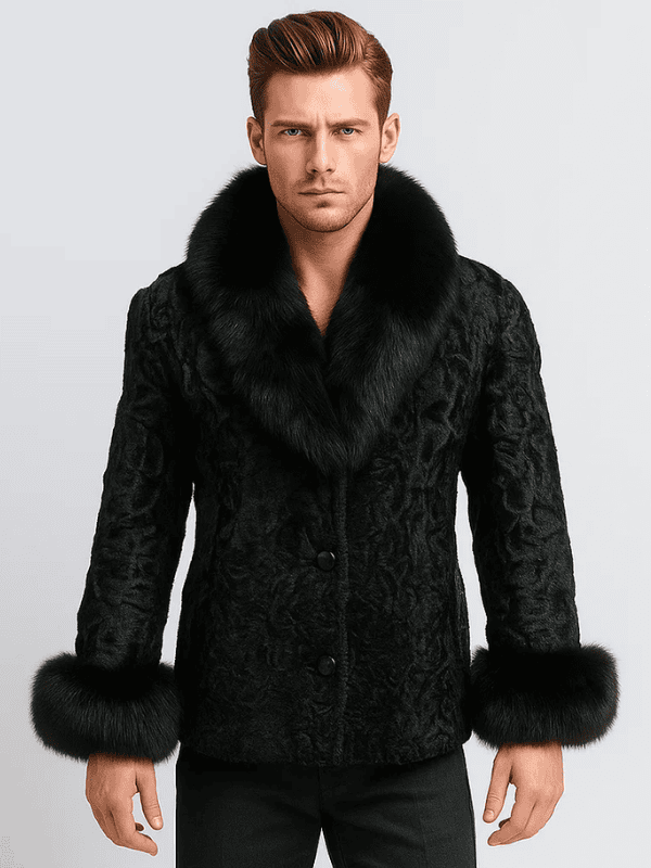 Men’s Black Persian Lamb Fur Coat with Fox Fur Collar & Cuffs