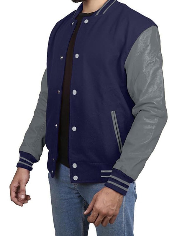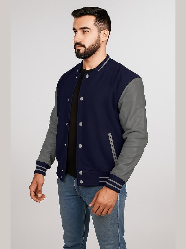 Men’s Navy Blue Varsity Jacket With Grey Sleeves