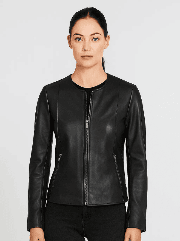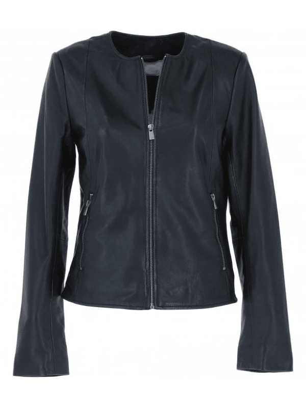 Women's Black Collarless Leather Jacket Original price was: $248.99.Current price is: $179.99.